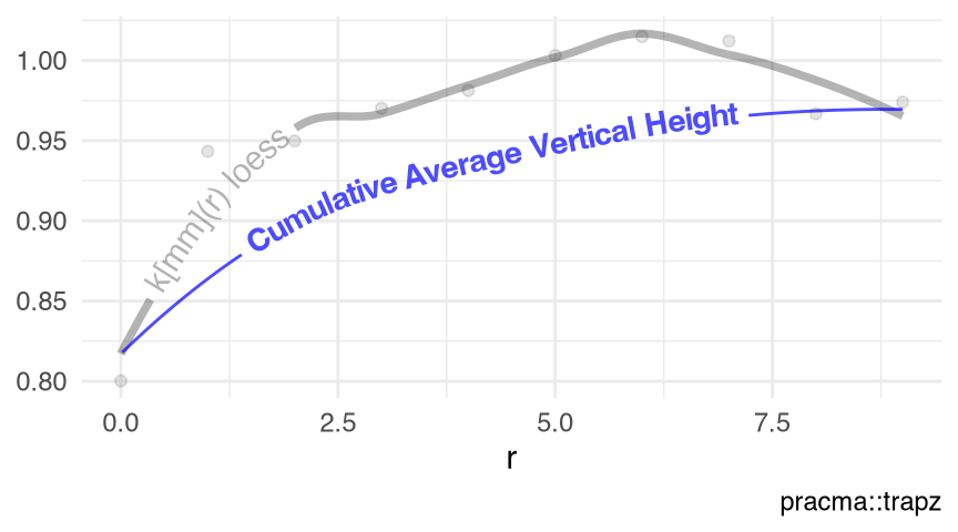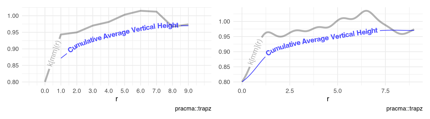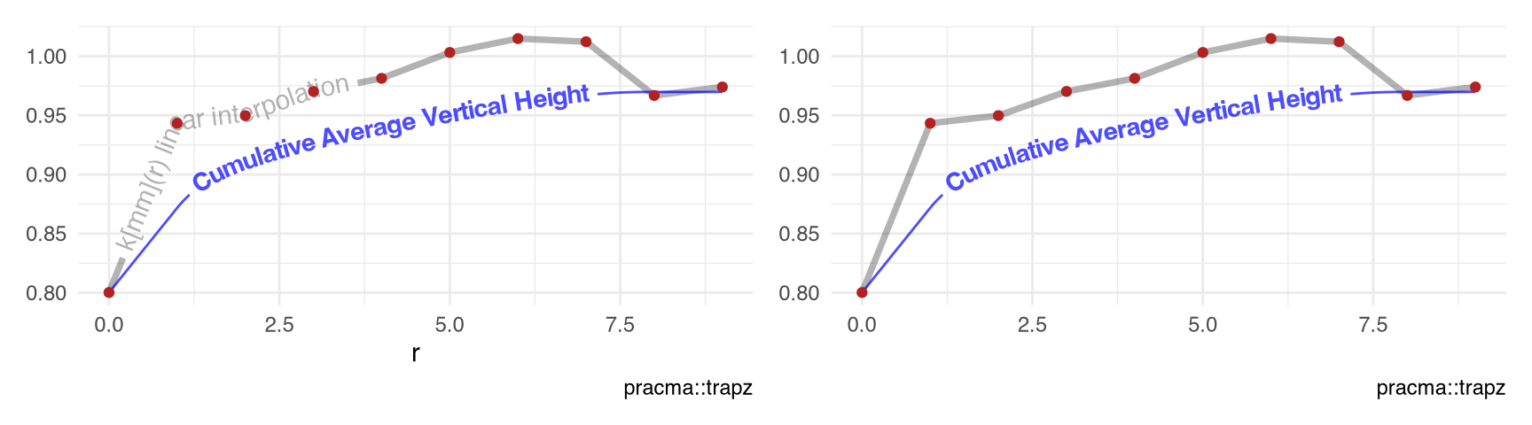 An experienced reader may wonder: is it truly advantageous to compute a coarse function-value-table and then perform interpolation and/or smoothing, rather than computing a fine function-value-table to start with? This is an excellent question! In fact, we observe no substantial difference in computation time via package microbenchmark(Mersmann 2024, v1.5.0) even when the grid of the \(r\)-vector is 100 times finer (Listing 20.24), as of package spatstat.explore (v3.6.0.5)! This observation justifies the use of the plain-and-naïve trapezoidal integration (Chapter 11, Section 11.1) on a finefv.object (Figure 20.9, Right), rather than employing more sophisticated numerical integration methods, e.g., the Simpson’s rulepracma::simpson(), the adaptive Simpson quadraturepracma::quad(), etc. on an interpolation and/or smoothing of a coarsefv.object (Figure 20.6, Figure 20.7, Figure 20.8).