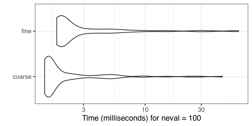 suppressPackageStartupMessages(library(spatstat))microbenchmark::microbenchmark(coarse =markcorr(spruces, r = r$coarse),fine =markcorr(spruces, r = r$fine)) |> microbenchmark:::autoplot.microbenchmark() + ggplot2::labs(title =NULL) + ggplot2::theme_bw()