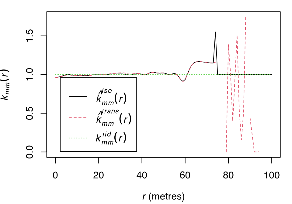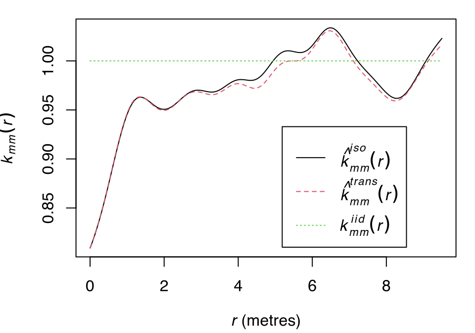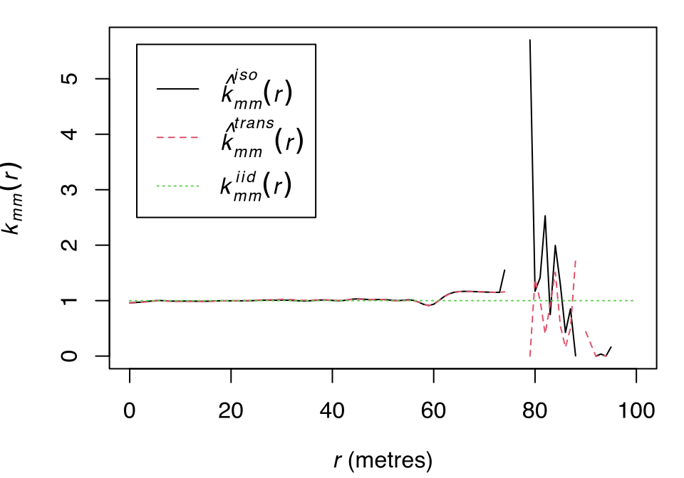 spruces_k |> spatstat.explore::print.fv()# Function value object (class 'fv')# for the function r -> k[mm](r)# ................................................................................# Math.label Description # r r distance argument r # theo {k[mm]^{iid}}(r) theoretical value (independent marks) for k[mm](r)# trans {hat(k)[mm]^{trans}}(r) translation-corrected estimate of k[mm](r) # iso {hat(k)[mm]^{iso}}(r) Ripley isotropic correction estimate of k[mm](r) # ................................................................................# Default plot formula: .~r# where "." stands for 'iso', 'trans', 'theo'# Recommended range of argument r: [0, 9.5]# Available range of argument r: [0, 9.5]# Unit of length: 1 metre