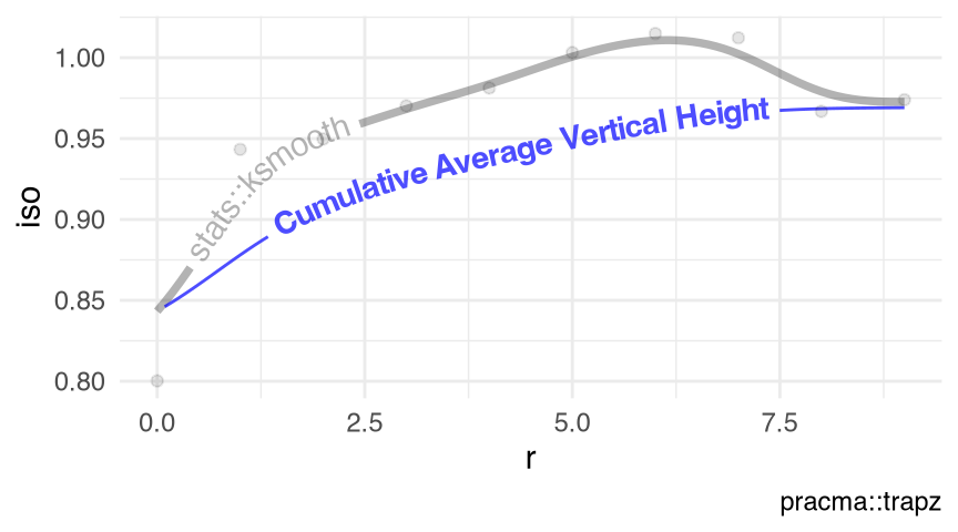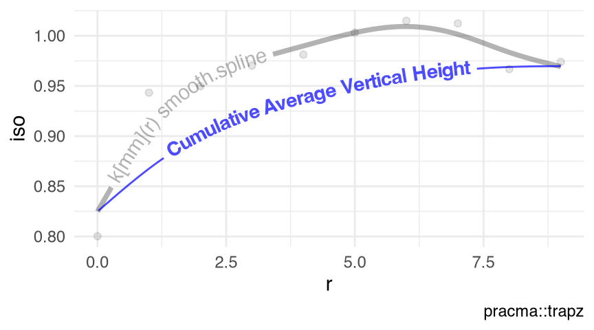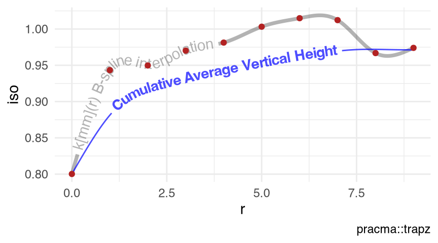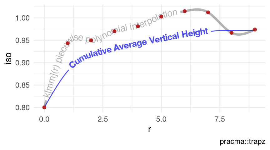 The S3 method visualize_vtrapz.fv() (Section 10.3, Table 10.2) visualizes the cumulative average vertical height of the trapezoidal integration (Section 10.2) under the recommended function values