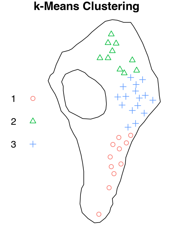 set.seed(21); vesicles_k2 = spatstat.data::vesicles |>kmeans.ppp(formula =~ x + y, centers =3L)vesicles_k2# Planar point pattern: 37 points# window: polygonal boundary# enclosing rectangle: [22.6796, 586.2292] x [11.9756, 1030.7] nm# with k-means clustering of 11, 10, 16 points