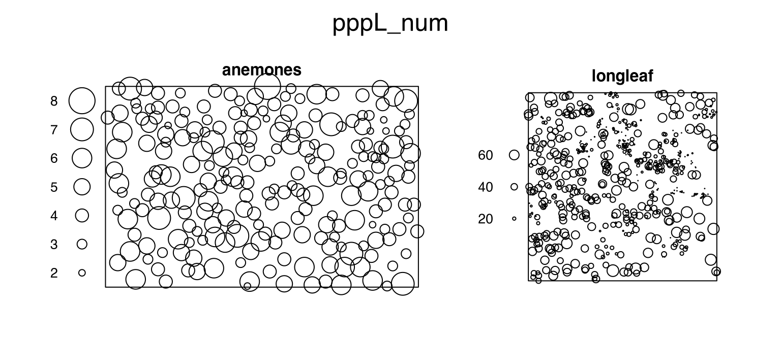 Listing 37.2 creates a point-pattern-list pppL_num that contains the point-patterns anemones (Section 10.1) and longleaf (Section 10.15), both with one numeric mark.